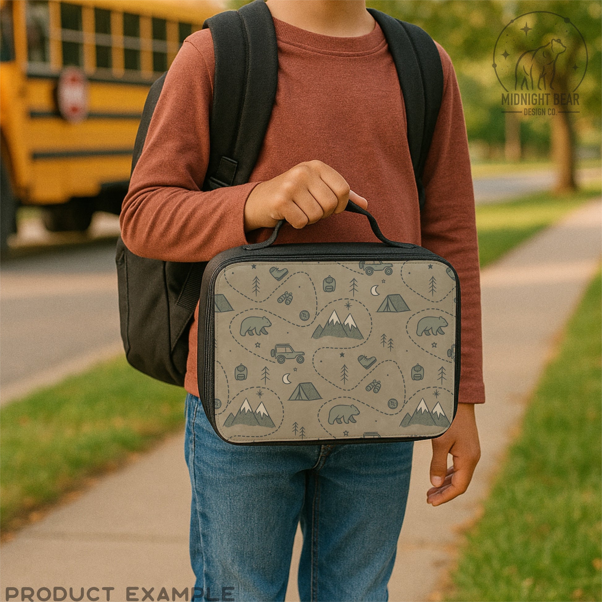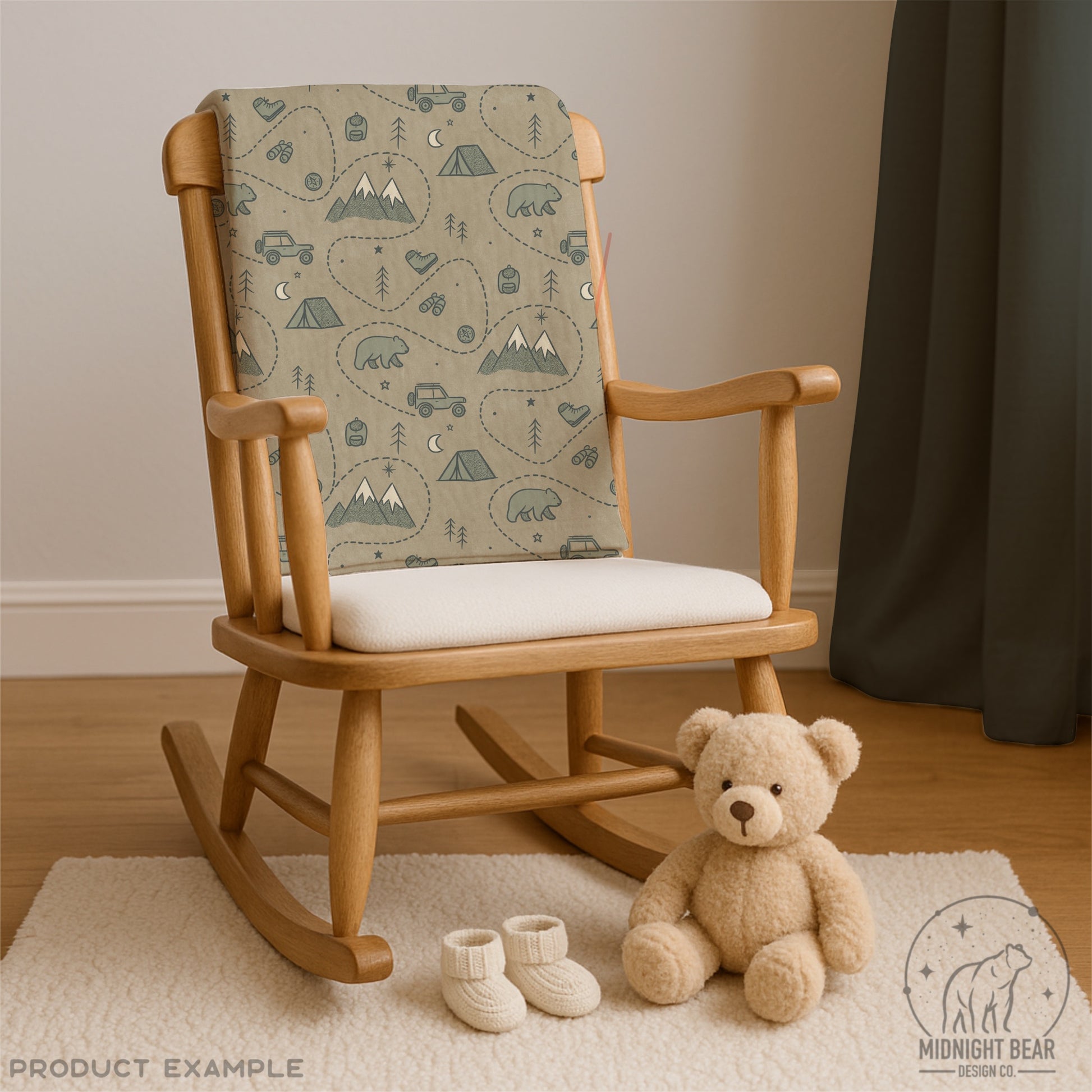 Inspired by quiet trails and outdoor adventures, this explore-themed seamless pattern features hand-drawn camping icons including bears, mountains, tents, jeeps, trees, hiking boots, backpacks, and winding trail paths. Rendered in a soft sage and earthy neutral palette, this design captures a cozy, vintage outdoor feel with a playful, illustrated charm.