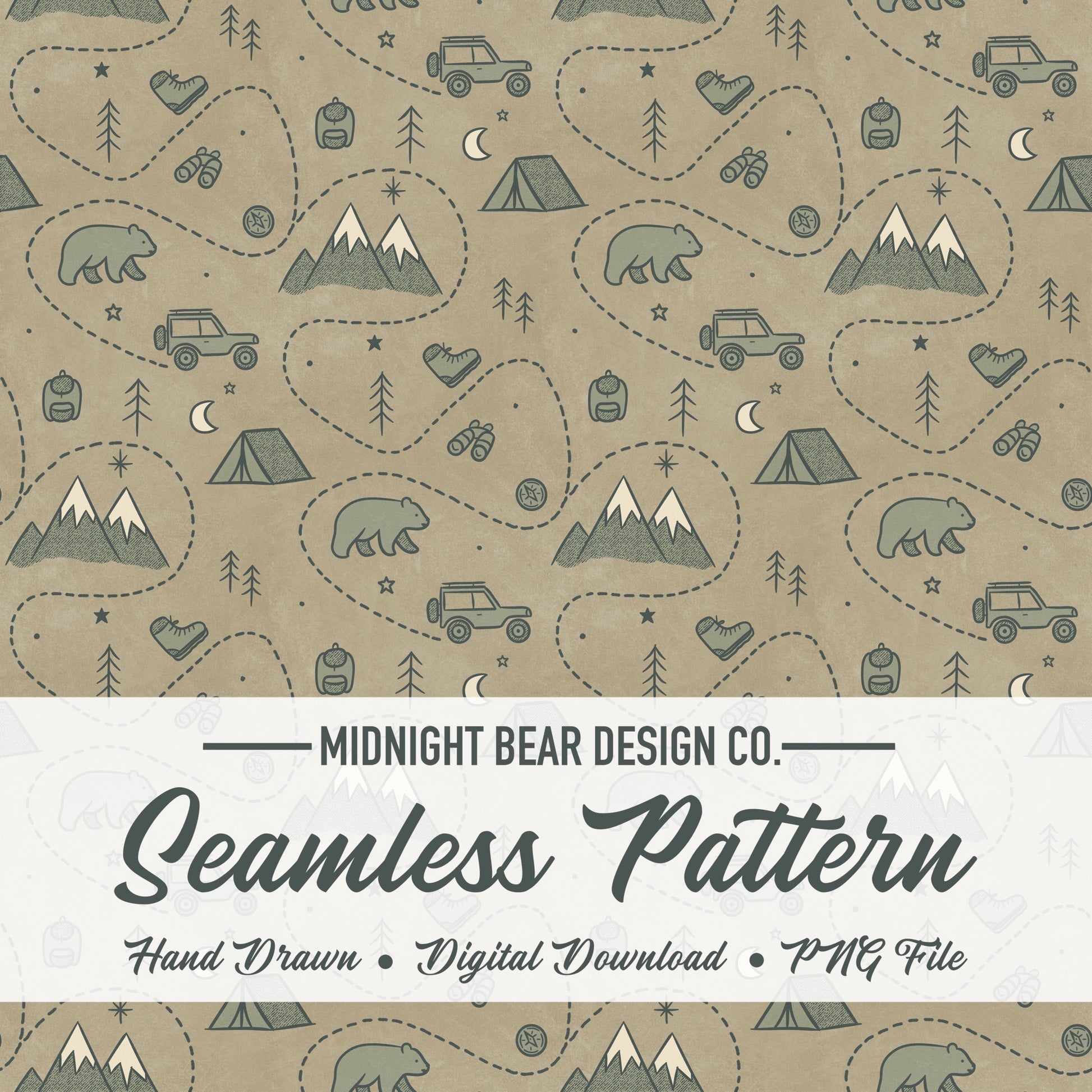 Adventure Camping Seamless Pattern | Explore Outdoors Illustration | Bear Mountain Camp Jeep Kids Pattern for Fabric, Crafts, Scrapbooking