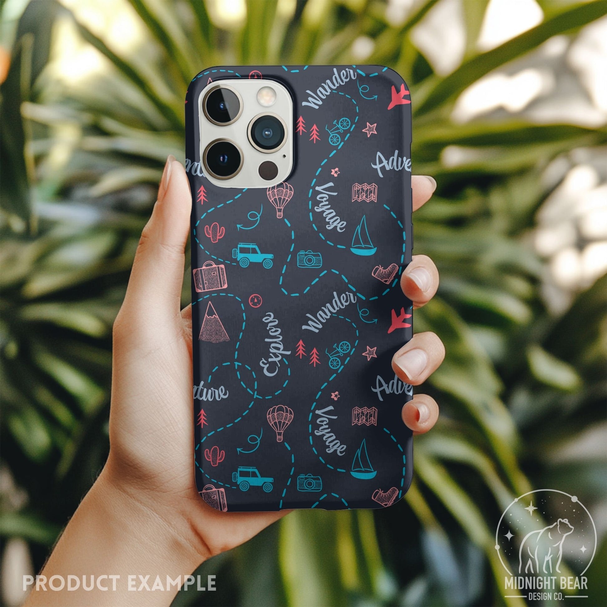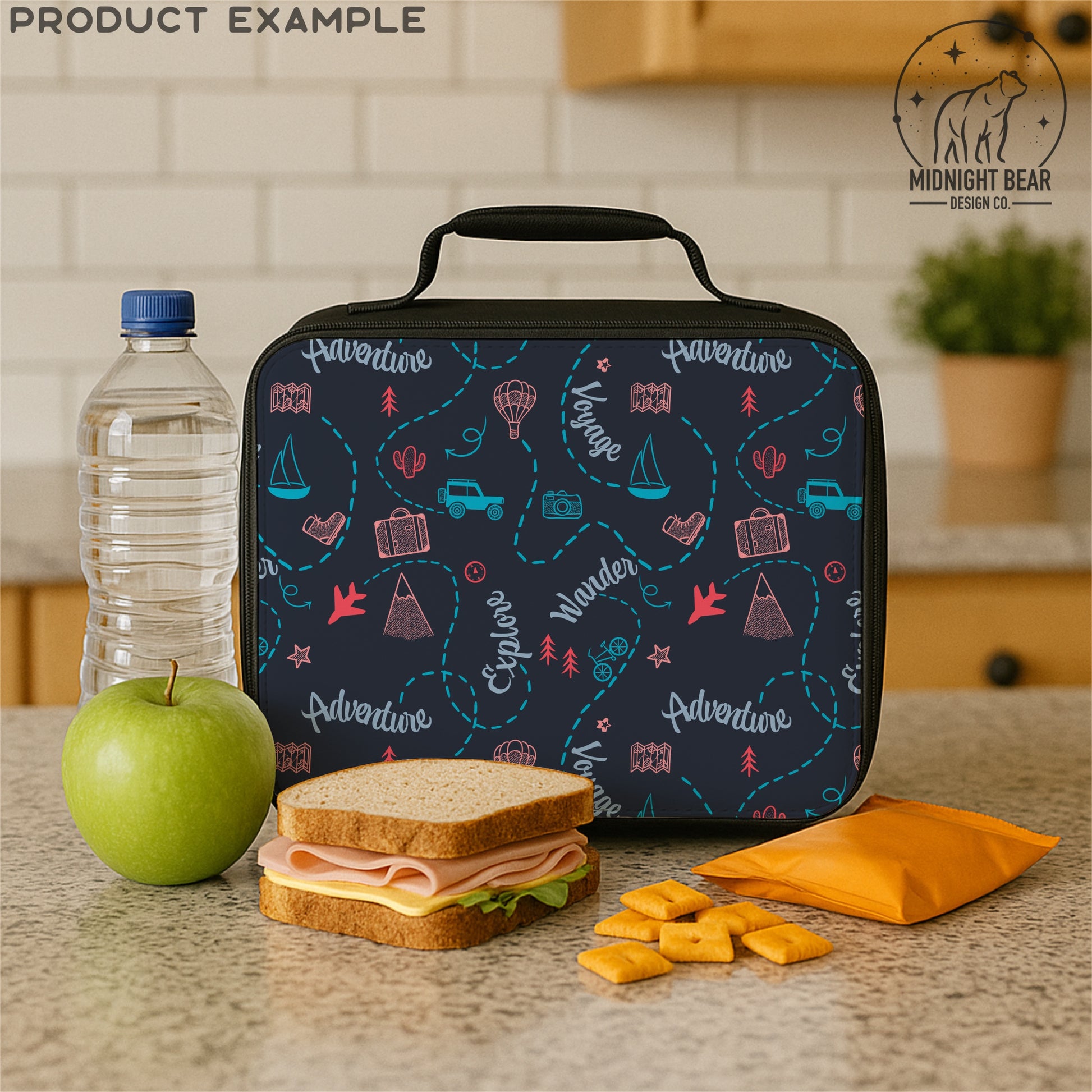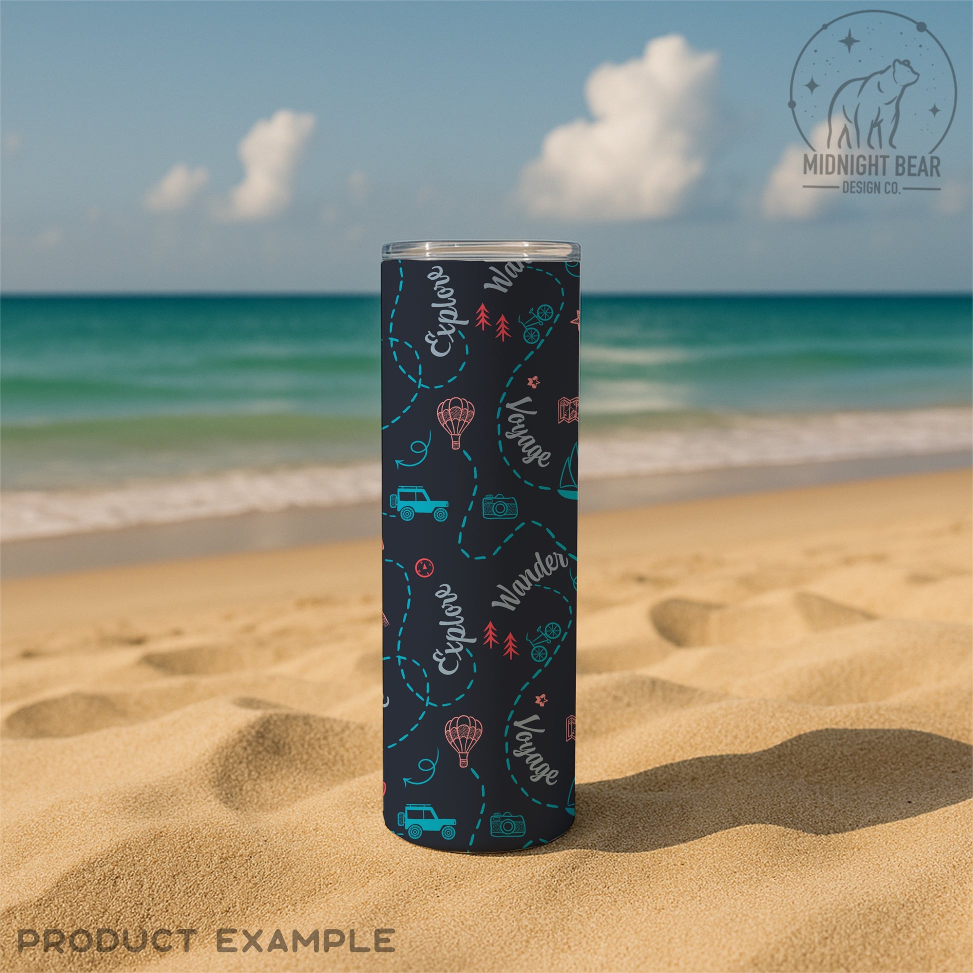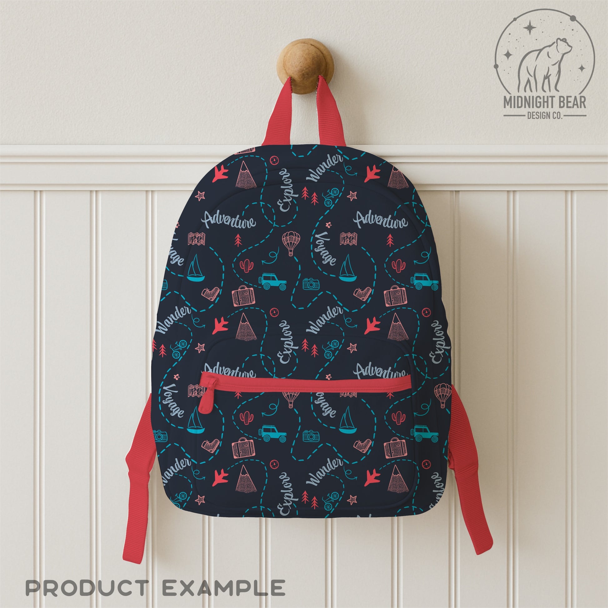 Embark on a bold and colorful journey with this Adventure Doodle Seamless Pattern! Featuring playful travel icons—including jeeps, sailboats, cameras, airplanes, mountains, hot air balloons, and dotted adventure paths—this version pops with vibrant pinks and blues on a deep navy background. The hand-drawn look adds a charming, whimsical feel perfect for wanderlust-themed creations.