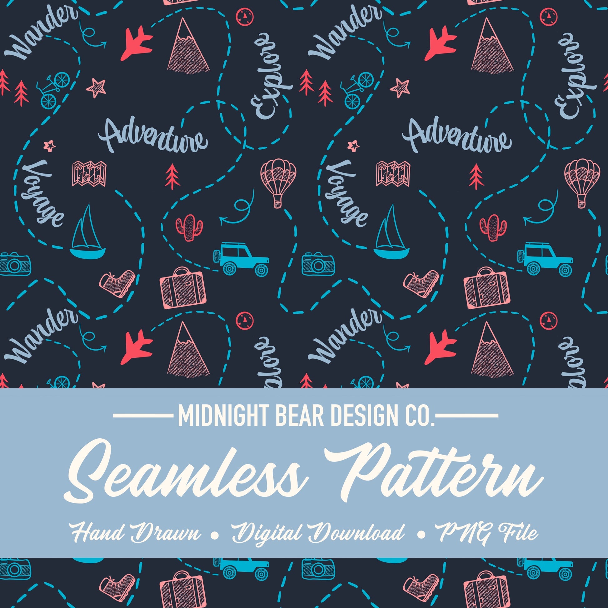 Adventure Doodle Seamless Pattern | Travel Digital Paper, Wanderlust Fabric Design, Explore & Voyage Scrapbook Background, Hand drawn