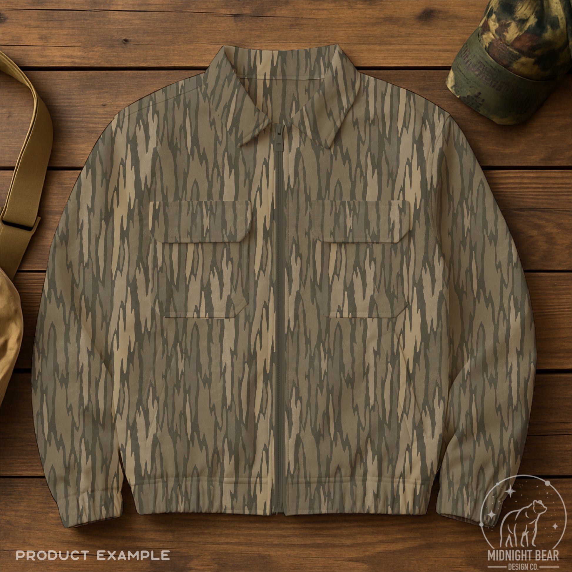 Blend effortlessly into the great outdoors with this Light Bark Camo Seamless Pattern! Inspired by classic timber camouflage, this design features vertical bark-like shapes in warm earthy tones — including tan, olive, sand, and deep forest green. The soft, textured finish gives it a rugged yet refined look that works beautifully for both modern and vintage outdoor themes.