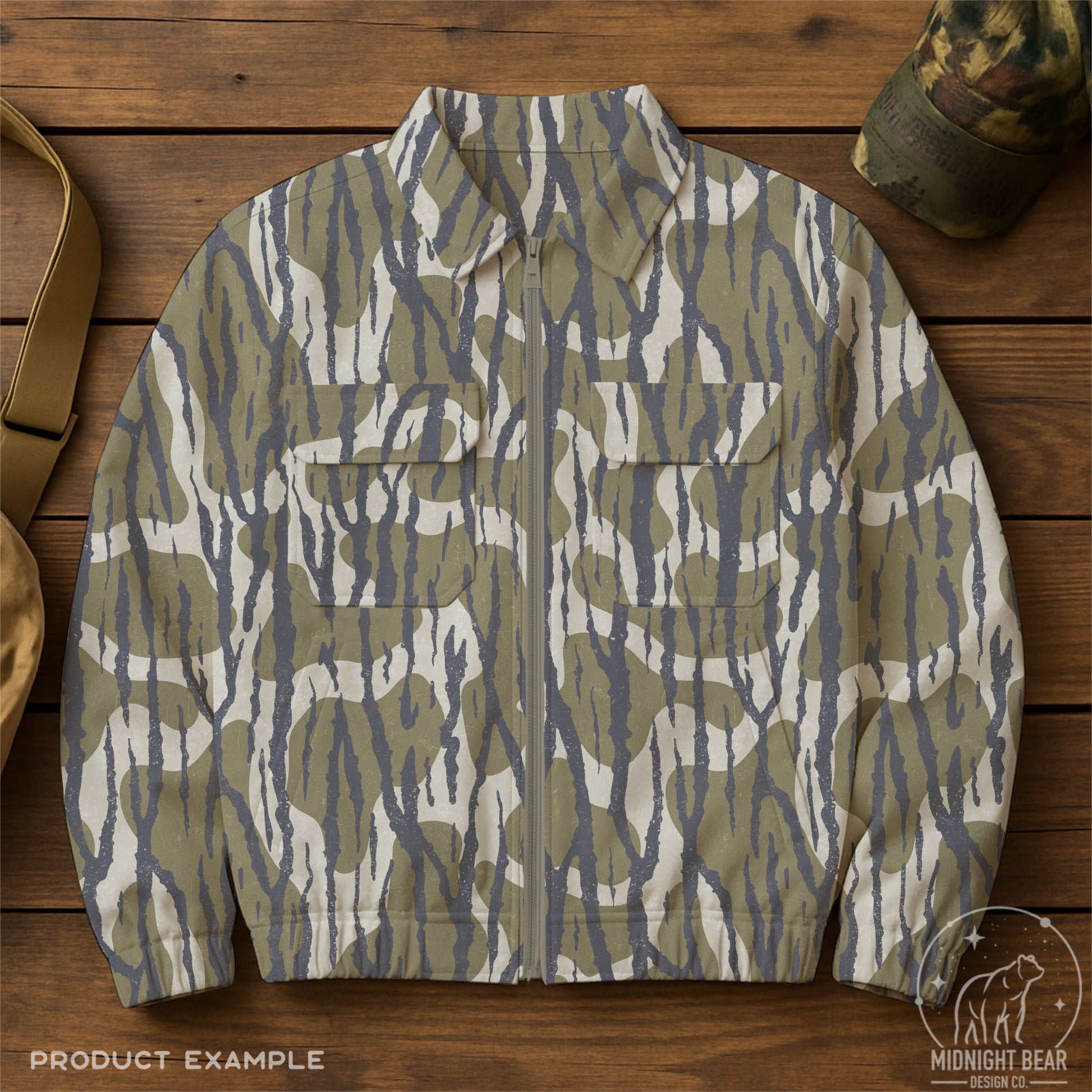 This Organic Bark Camo Seamless Pattern is inspired by layered tree bark textures and natural woodland camouflage. Hand-drawn vertical forms overlap in soft, irregular shapes, creating depth and movement while maintaining a balanced, repeatable layout.