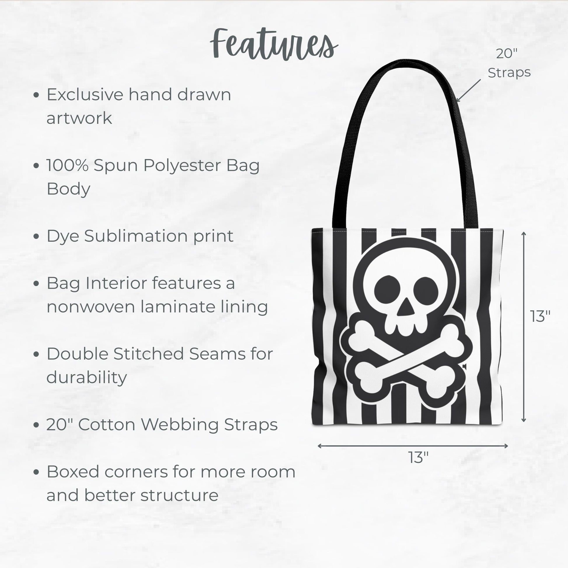 Skull and Crossbones Trick or Treat Bag – 13" Striped Black and White Halloween Tote
