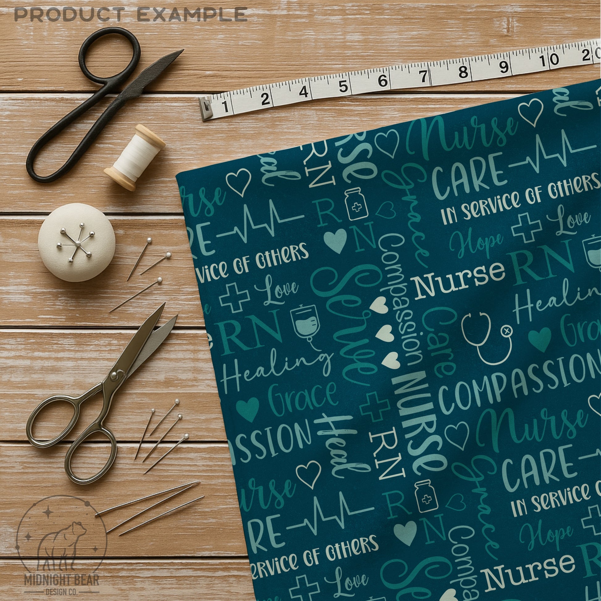 This seamless nurse word grid pattern celebrates compassion, care, and service through a thoughtfully curated mix of hand-lettered words, symbols, and icons associated with the nursing profession. Featuring phrases like Nurse, RN, Compassion, Care, Healing, Grace, and In Service of Others, this design blends script and block typography with medical motifs such as hearts, crosses, stethoscopes, IV bags, and EKG lines.