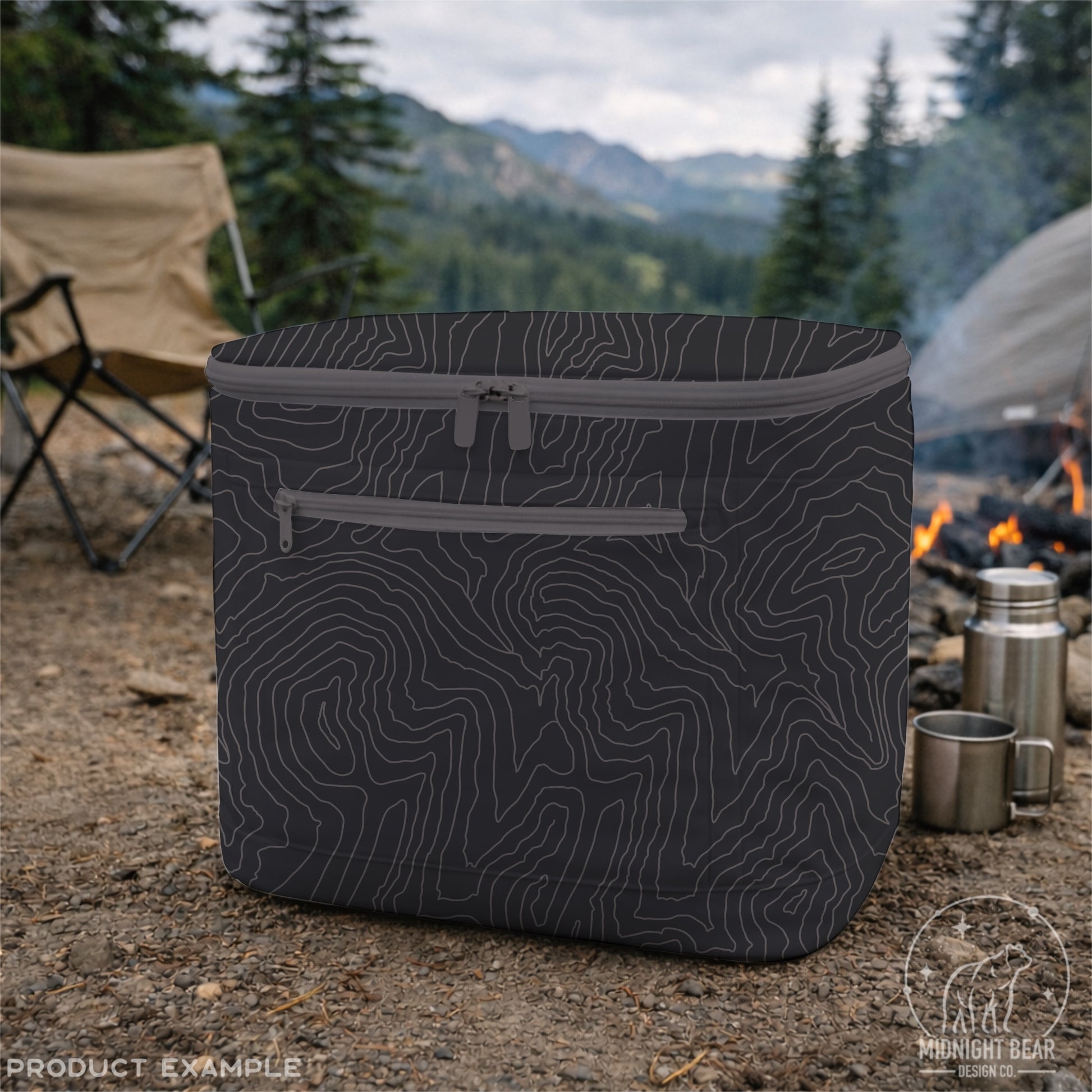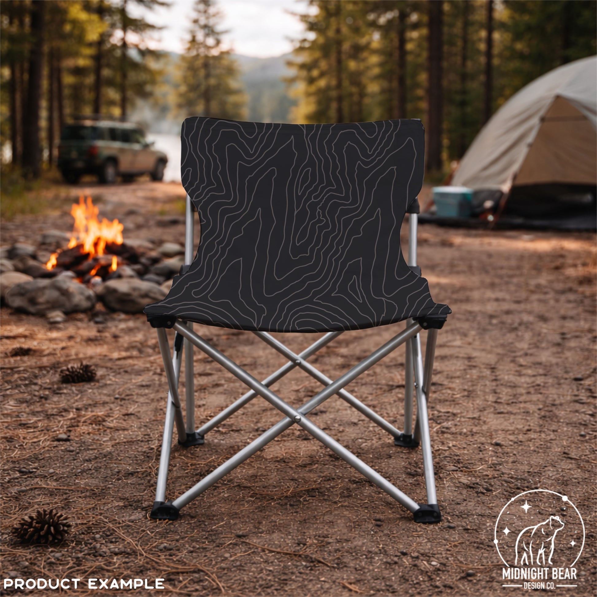 Rendered in a rich charcoal background with soft contrasting contour lines. Its neutral palette makes it easy to pair with outdoor, adventure, camo, or minimalist collections without overpowering focal designs. This pattern is ideal for projects that call for a rugged, outdoorsy feel with a refined, professional finish.